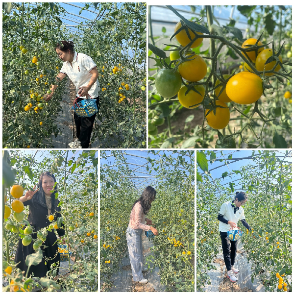 活动当天,阳光和煦,微风宜人。老师们怀着期待的心情抵达采摘园,在工作人员的引导下有序进入果蔬大棚。一踏入棚内,鲜嫩饱满的小番茄便映入眼帘,黄色、绿色的果实挂满枝头,晶莹剔透;翠绿的黄瓜藤蔓沿着支架攀爬,顶花带刺的果实垂坠其间,散发着清新的蔬果香气。