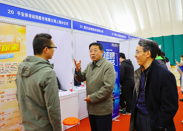 温景春与招聘会现场的企业代表、校友代表沟通,了解校企协同育人进展。他肯定了学院联动、整合资源为毕业生搭建实习就业平台的模式,希望各学院加强优势互补,在学科交叉人才培养方面多思考、多实践,打造协同育人的就业生态。