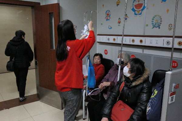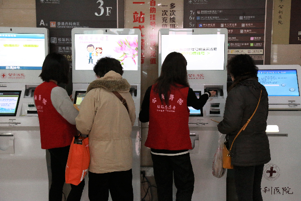 在公利医院的负责人进行人员分配后,每位同学都得到了各自的任务,他们在一楼负责挂号,在二楼负责挂号和打印报告单,在三楼的一站式机器旁提供一站式服务和打印报告单,还有几位同学在输液室陪诊病人,他们用阳光的笑脸给来往的人以帮助与关怀。
