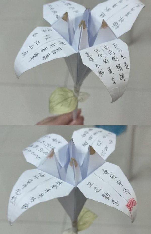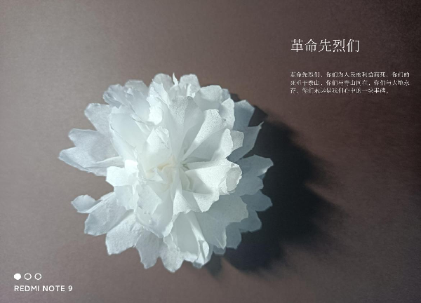 活动从“以花飨逝者”、“以画现故人”、“以文显旧迹”三个层面展开,鼓励同学们根据实际条件以折纸花、绘画或书法的形式传递出“致敬英雄,共悼逝者”的心声。活动过程中,同学们积极参与,或在纸花上附上对牺牲的革命先烈,慷慨赴义的逆行者们的悼念;或以绘画和书法为载体,勾勒出英雄们的模样,写下豪情壮志,期许未来,以告英灵。经统计,勤耘社共收到作品110余份。通过认真评选,王艳男、陆艺心、金思荣三位同学获得折纸组优秀奖,刘鸥影、赵祎婕、徐菁三位同学获得绘画组优秀奖,李靖博、沈玉颖、杨琳三位同学获得书法组优秀奖。
