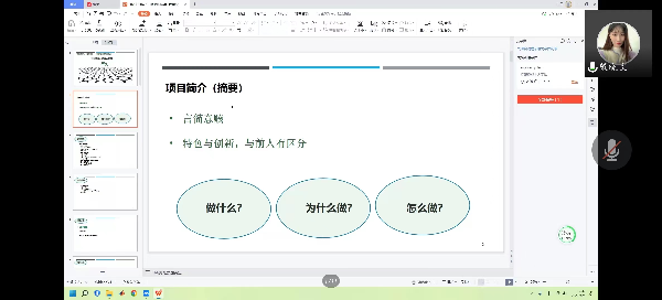 戴老师以自己所写的项目申报为模板,系统全面地介绍了项目申报书需要填写的内容,并对目前大学生项目申报书中常见问题如简介内容过多、语言不够严谨、经费预算问题等进行重点讲解。戴老师还提出了很多可供借鉴的经验和建议,鼓励同学们针对当下政策和问题来提出自己的创新想法,在对前人成果进行搜集和研究的基础上,不断提升自己的项目质量,找到立足点和突破点。