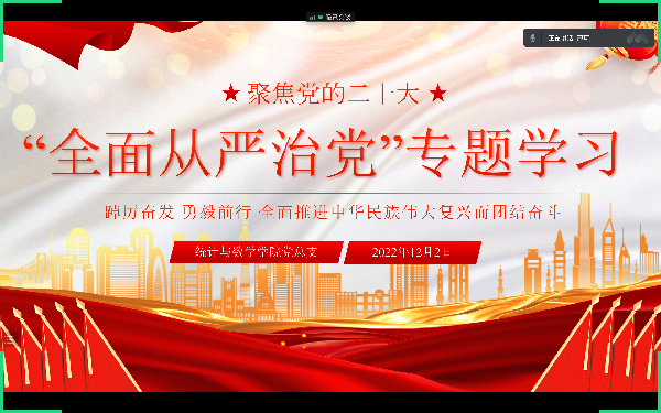 刘伟领学《“全面从严治党”首次写入党章|党章修改背后的故事》和党的二十大报告中“坚定不移全面从严治党,深入推进新时代党的建设新的伟大工程”有关内容,带领与会人员了解全面从严治党的提出和发展,强调要提高政治站位,充分认识全面从严治党的重要意义,要坚持以习近平新时代中国特色社会主义思想为指导,深刻认识“两个确立”的决定性意义,增强“四个意识”、坚定“四个自信”、做到“两个维护”,对标对表党中央全面从严治党新部署新要求,准确认识全面从严治党在“为党育人、为国育才”中的关键作用,坚持不懈把全面从严治党向纵深推进,以全面从严治党引领保障学院落实立德树人根本任务,推动学院事业高质量发展。