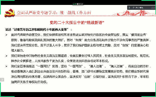 会议最后,全体人员集体学习了《上海立信会计金融学院党委意识形态工作责任制实施细则》和《党的二十大报告中的“统战新语”》,就学院网络评论员队伍建设、党员领导干部与党外人士交友联谊工作等进行了部署。