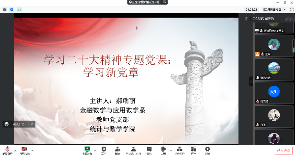 为深入学习贯彻党的二十大精神,2022年12月28日,副院长(挂职)、金融数学与应用数学系教师党支部书记郝瑞丽同志为本支部和对接联系的3个党支部上专题党课,本次活动也是学院四个支部共建联学的一次主题党日活动。金融数学与应用数学系教师党支部、公共数学部教师第一党支部、公共数学部教师第二党支部和学生第三党支部的30余名党员参加了学习。