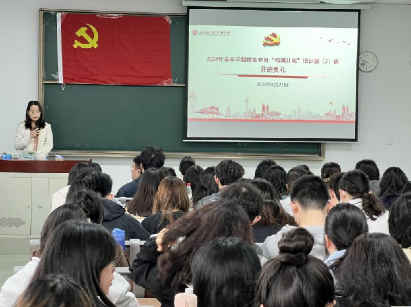 4月21日,2024年春季学期预备党员“铸魂计划”培训班(2)班开班典礼在上川路校区第二教学楼411教室举行,统计与数学学院专职组织员邢珂,学生第二党支部书记、培训班班主任梅凤娟,以及138名预备党员全员参加。开班典礼由梅凤娟主持。