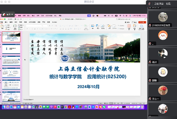 10月17日,学院通过腾讯会议开展了2025年应用统计专硕招生校内宣讲会,由学院院长石磊教授主讲。石教授详细介绍了考研政策和硕士点概况,助力校内应届考生详细了解本学位点研究方向和招录人数等信息。此外,石教授向学生介绍了统计学专业和应用统计专硕的发展前景,并诚挚欢迎大家报考。