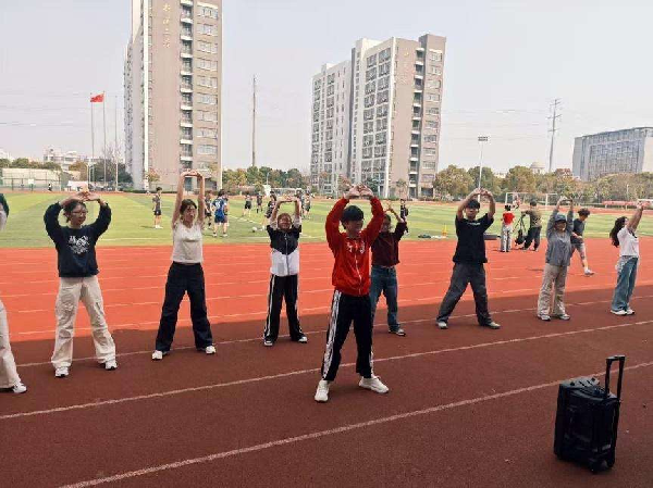 午间时分,随着舒缓的音乐奏响,活动进入"八段锦"专场。在朱泓亦同学的示范带领下,同学们整齐站定,跟随悠扬的古乐缓缓舒展身躯。双手托天理三焦,动作舒展流畅;摇头摆尾去心火,姿势俏皮灵动。一招一式刚柔并济,动作整齐划一,现场宛如一幅动静相宜的画卷。八段锦作为国家级非遗项目,既能强身健体,又能修身养性,这与当代大学生的生活理念高度契合。