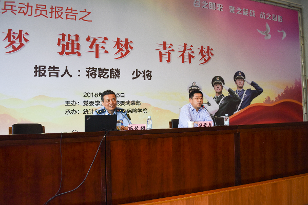 为加强当代大学生国防教育、开展专项征兵政策宣传工作,鼓励我校大学生积极应征入伍,由校党委学工部、党委武装部主办,统计与数学学院和保险学院共同承办的“强国梦、强军梦、青春梦”2018年征兵宣传动员大会于2018年5月16日13点在行政楼报告厅顺利举行。校党委副书记、纪委书记温景春、原解放军南京政治学院院长、博士生导师、空军少将蒋乾麟教授应邀出席,统计与数学学院党总支副书记陈秋兰主持会议,相关职能部门领导及老师参与会议。统计与数学学院与保险学院500余名师生参加了讲座。