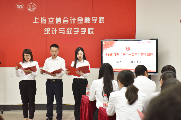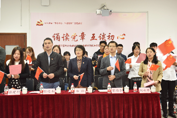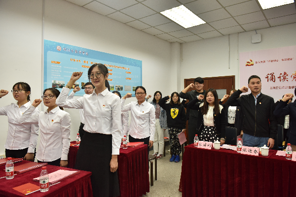公共数学部教师第一党支部党员师生声情并茂,分组诵读《中国共产党章程》(节选),重温了党的性质、党的宗旨、党的指导思想与奋斗目标,党员义务与党员权利等党章原文。6名党员师生结合诵读内容和个人实际畅谈不忘初心、牢记使命。现场举行了党员教师与2019级入党申请人的结对仪式,和重温入党誓词的宣誓仪式。