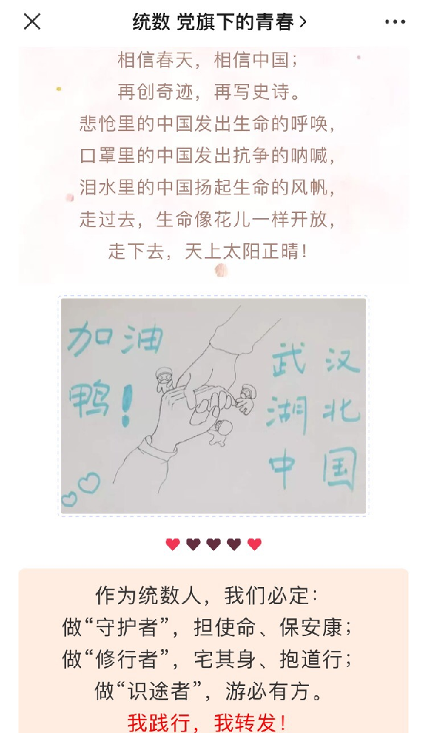 学院各党支部开展“众志成城抗疫情,我是党员我先行”线上主题党日活动,深入学习习近平总书记对疫情防控工作的重要指示精神,激发学生党员积极发挥先锋模范作用,彰显青年责任与担当。学院党员学生积极参与到疫情防控宣传工作中,引导同学们寒假期间做好防控工作,正确理解、积极配合,做到不信谣、不传谣、不麻痹、不恐慌。同时通过微信公众号发布、转发暖心祝福与承诺,传播正能量,呼吁全体同学做“守护者”,担使命、保安康;做“修行者”,宅其身、抱道行;做“识途者”,游必有方。