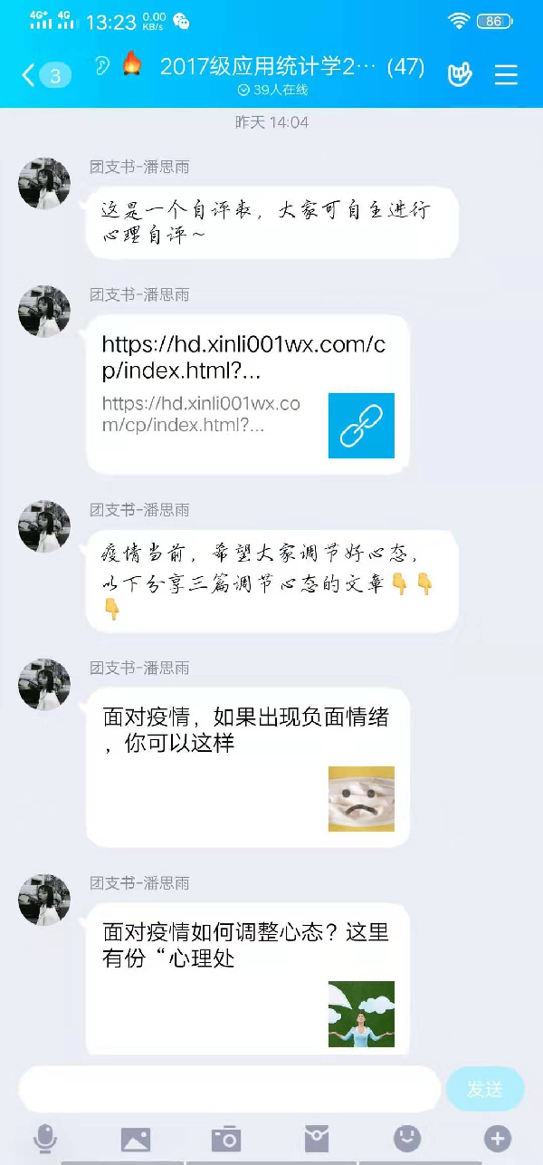 学院青马分会向全体学生党员发出倡议,鼓励大家始终牢记党员身份,以实际行动践行党的宗旨,主动担当,加强同学之间的网上联络,协助学校学院、老师做好疫情防控的辅助工作。党员学生除了协助辅导员做好“每日一报”外,主动在班级群分享文章,营造积极乐观的心态,防止恐慌,增强学生政治意识和大局意识,严格遵守在校和返校相关规定;主动分享MOOC等学习资源,号召同学们做到假期不放松、学习不止步。