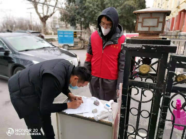 近日来,学生党员除了服务班级、捐献爱心外,还有部分党员学生在家乡也挺身而出、冲锋在前,发挥党员模范带头、志愿参与到家乡防控大格局,全力以赴打赢这场人民战争。预备党员董立文说:我在社区进行了志愿服务,工作岗位是小区的大门,主要工作是对进出人员进行测量体温及登记,严格控制人员流动。在工作的过程中我体会到了一线工作人员的辛苦与危险,在寒冷的天气下,冒着被传染的风险为人民服务。但在这一关键时刻,能够为祖国、为人民贡献一份力量,我感到十分的荣幸与骄傲。”