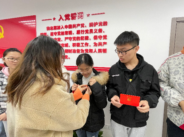 宣誓仪式在庄严的国际歌声中拉开帷幕。受党总支委托,梅凤娟为预备党员颁发《入党通知书》并佩戴党徽,潘瑜带领预备党员进行入党宣誓。